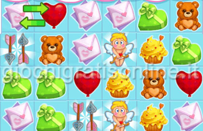 Grafica ispirata alla Festa di san Valentino per questo gioco in cui bisogna allineare almeno tre pezzi uguali per eliminarli.