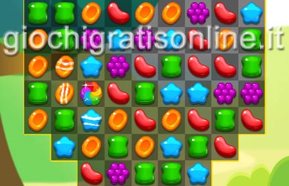 Gioco del tipo ''allinea tre pezzi'' a tema dolciario. Scambiate di posto due dolcetti adiacenti cercando di allinearne almeno tre uguali per eliminarli.